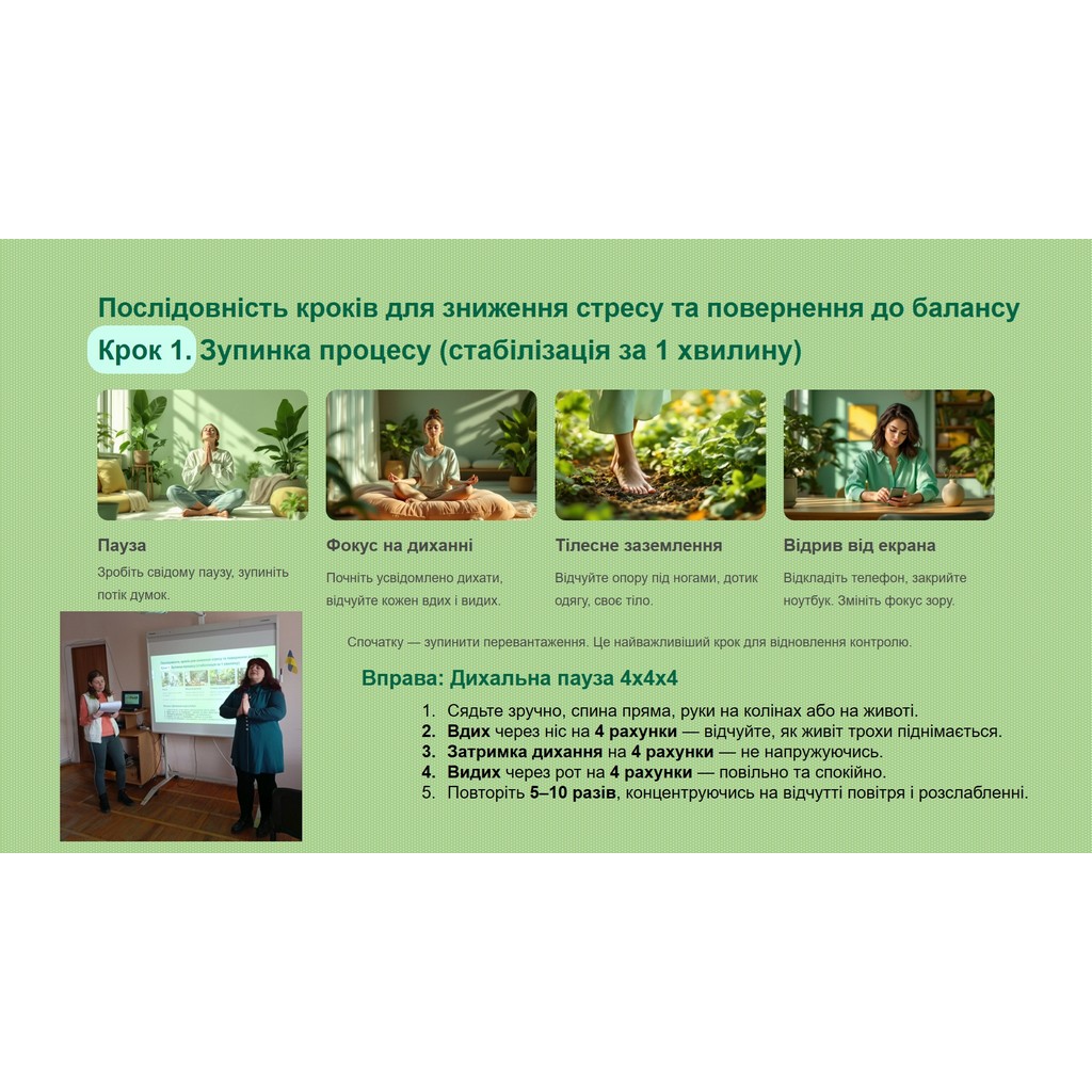 Під час практичної частини відбулися інтерактивні вправи «Інформаційний термометр» і «Фільтр інформації». Вони допомогли учасникам оцінити рівень власного інформаційного навантаження, визначити джерела цифрового стресу та знайти способи його зменшення. Окрему увагу приділили базовим технікам відновлення уваги та емоційної стабілізації.