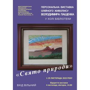 4 листопада 2025 року о 14.00 в холі бібліотеки відбудеться відкриття персональної виставки творчих робіт Володимира Пащенка «Барви природи» (олійний живопис).