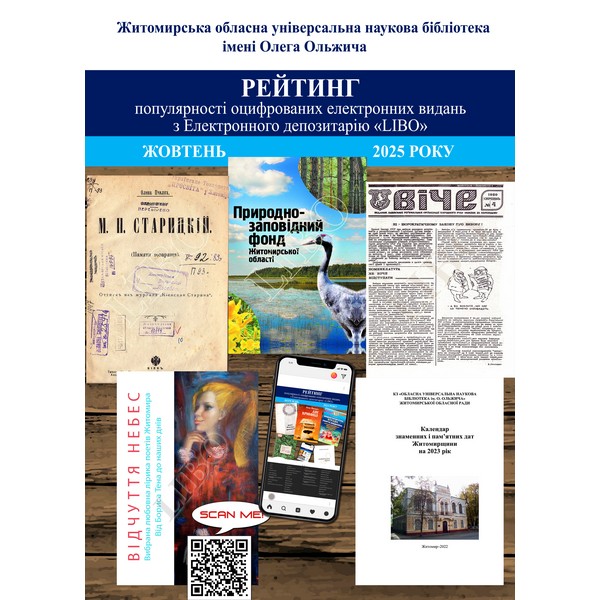 Пропонуємо Вашій увазі ТОП-5 найбільш популярних видань у жовтні 2025 року за рейтингом перегляду з електронного ресурсу оцифрованих документів ОУНБ ім. О. Ольжича Житомирської обласної ради.