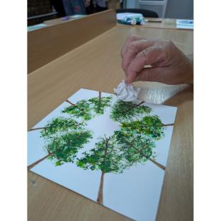 Також виготовляли картину зайця та лисиці з картону та перероблених матеріалів. Малювали лісовий пейзаж. Виготовляли підвіску для декору лева з клаптиків тканини та одноразового посуду.