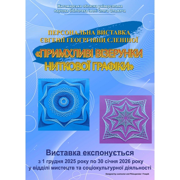 З 1 грудня 2025 року по 30 січня 2026 року у відділі мистецтв та соціокультурної діяльності ЖОУНБ ім. О. Ольжича експонується персональна виставка «Примхливі візерунки ниткової графіки» майстрині Євгенії Георгіївни Єленіної (м. Житомир).