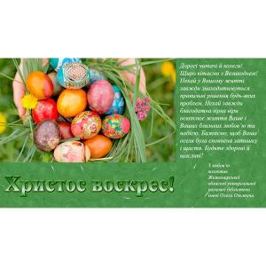 Щиро вітаємо з Великоднем! Нехай у Вашому житті завжди знаходитимуться правильні рішення будь-яких проблем. Нехай завжди благодатна зірка віри освітлює життя Ваше і Ваших близьких любов’ю та надією. Бажаємо, щоб Ваша оселя була сповнена затишку і щастя. Будьте здорові й щасливі.