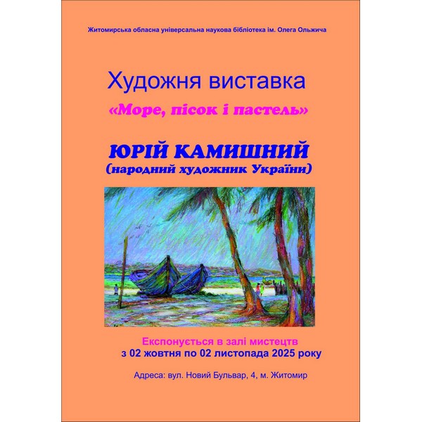 2 жовтня 2025 року о 16.00 у відділі мистецтв та соціокультурної діяльності відбудеться відкриття персональної виставки (живопис) «Море, пісок і пастель» народного художника України Юрія Камишного.