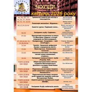 Шановні користувачі, щодня в нашій бібліотеці відбувається безліч цікавих заходів та подій, ознайомтесь будь-ласка з календарем заходів на квітень 2026 року, та приходьте до нас.