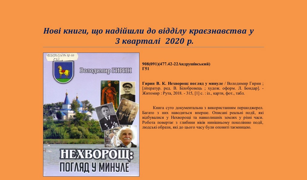 Нові книги, що надійшли до відділу краєзнавства у 3 кварталі 2020 р.