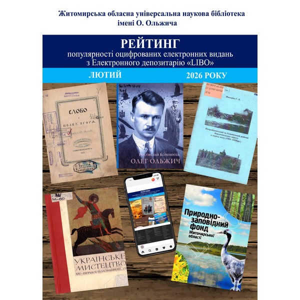 Пропонуємо Вашій увазі ТОП-5 найбільш популярних видань за рейтингом перегляду з електронного ресурсу оцифрованих документів ОУНБ ім. О. Ольжича Житомирської обласної ради у лютому 2026 року.