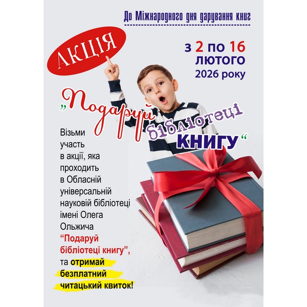 До Міжнародного дня дарування книг з 2 по 16 лютого 2026 року в Обласній універсальній науковій бібліотеці проходитиме акція «Подаруй бібліотеці книгу». Запрошуємо всіх охочих подарувати бібліотеці видання українською мовою й отримати безплатний читацький квиток.